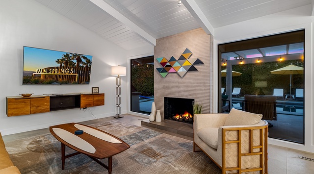 Iconic Hollywood legends line the entryway of this storied Alexander home in striking black and white photographs capturing Palm Springs' golden era. Exuding mid-century modern sophistication, with original tongue and groove ceilings and clerestory windows, this home features bold rooflines and seamless indoor-outdoor living spaces. This retreat opens to a brightly lit great room with views of the private pool and outdoor patio through sliding glass doors. A large gas fireplace and concrete tile flooring, draws guests into the heart of this home, where they can lounge on the sofa to watch the 65" TV or relax on 2 cozy armchairs.