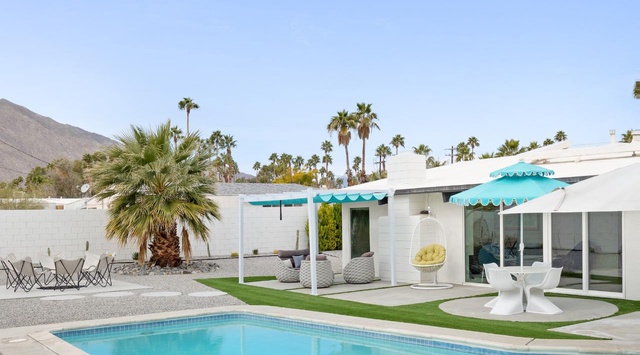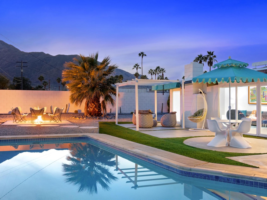 DETAILS: A Krisel-designed Alexander, Blue Martini is the epitome of mid-century modern living. This 3-bedroom, 2.5-bathroom home sleeps up to six guests and boasts both western and southern mountain views. Downtown restaurants and bars, Uptown shopping, golf courses, and hiking trails are only minutes away for daily fun. Though with a funky lounge space and a secluded private backyard oasis, guests may never want to leave the property!