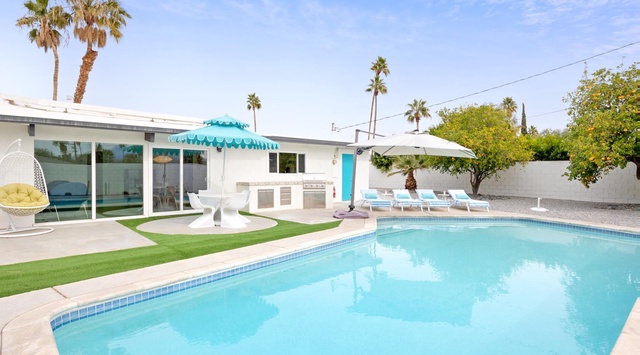 Blue Martini’s main entrance welcomes guests into a speakeasy-inspired bar and lounge area made for sipping sidecars or catching the big game. Continue into the connected kitchen, living, and dining area, beautifully styled in mid-century modern décor and bright color accents. The fully equipped kitchen is a chef’s delight and includes an island with stool seating for morning coffee and brunches. The oval dining table seats six and sits between the living space and kitchen. Unwind on the full-length sofa and comfy accent chairs while watching TV or cozying up by the gas fireplace. When the warm weather beckons, slip out the glass doors to the backyard, which features mountain views and a privacy wall for a peaceful setting. Relax by the pool or sit in the shade beneath the pergola. An alfresco dining table and custom built-in grill encourage dining poolside. After sunset, light the firepit and spend the evening chatting beneath the stars. Guests can retire at the end of the night to the primary bedroom featuring a king bed, Smart TV, private bathroom, and backyard access. There are also two guest bedrooms with Smart TVs—the first bedroom has a full bed, and the second has a king bed. For convenience, there’s a laundry room with a washer, dryer, and large sink.