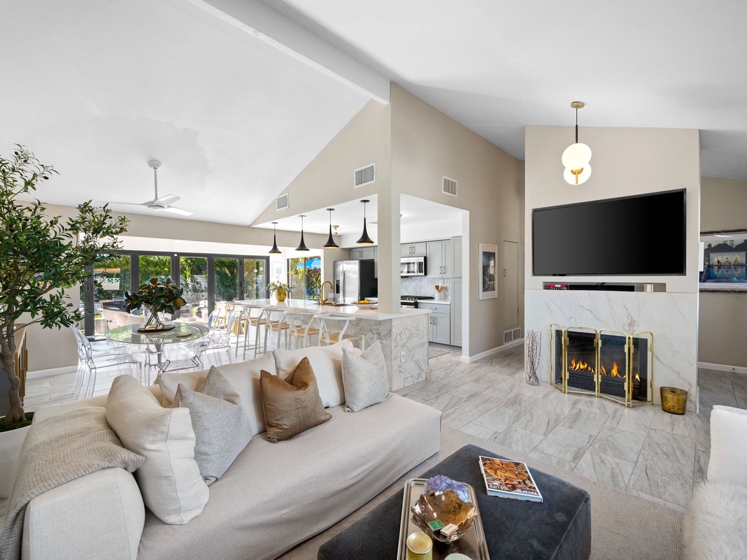 Soaring vaulted ceilings and swathes of natural light add an airy atmosphere to this home’s interior. Modern glamor reigns in every square inch, with luxe finishes and sumptuous materials throughout. Sink into the dual soft couches to watch TV or relax in comfort. A second seating area with 4 accent chairs provides a spot for conversing over cocktails. The contemporary kitchen boasts high-end appliances, a Nespresso coffeemaker, and a massive center island that doubles as a breakfast bar for 5. Savor delicious meals at the polished oblong table, accented by 6 clear acrylic chairs. Discover the lush backyard reminiscent of a hidden oasis through the sliding glass door. Take advantage of the sunny desert climate with an afternoon spent sunbathing on the chaise lounges or swimming in the organically shaped private pool. The intimate seating area and sitting spa encourage unwinding with friends, while the gas grill and dining table for 6 set the stage for outdoor meals. After sunset, enjoy a night by the firepit, toasting beneath the stars. Guests can retire to the spacious primary bedroom boasting a cloud-frame king bed, Smart TV, and direct access to the pool. The 2 guest bedrooms respectively feature 1 queen bed and 1 twin bed with 1 twin trundle. For convenience, the garage has an at-home gym, complete with weights, a Peloton, and yoga mats.