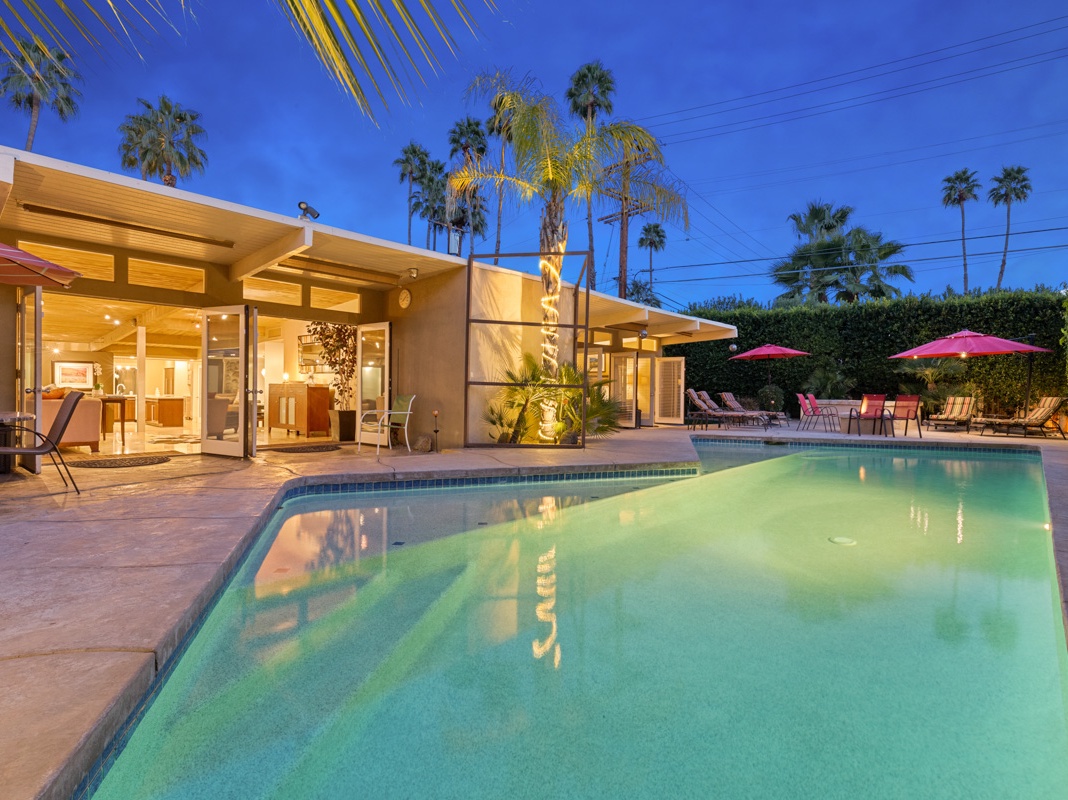 DETAILS: Designed by Donald Wexler, father of “desert modern” architecture, Casa Tranquillo is an outstanding 5-bedroom, 3-bathroom Palm Springs home that sleeps 10 guests. Nestled at the base of the San Jacinto mountains in The Mesa neighborhood, this home is 5 minutes from downtown and a mile from local hiking trails. Guests will love the mid-century design elements and private swimming pool—created to mirror the distinctive shape of Wexler’s signature butterfly roof.