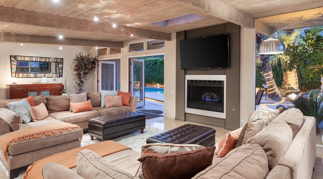 The backyard is landscaped with soaring palm trees, a Ficus privacy wall, and a lush side lawn with a lemon tree. Tanning ledges and water features invite fun in the swimming pool, or soak up the famed Palm Springs sun on chaise lounge chairs. Enjoy a drink at the shaded patio table with close-up mountain views. There is also a sitting spa, firepit, and 6-seat dining area with a grill. At bedtime, retire to the primary bedroom with a California king bed, TV, private bathroom, and poolside patio access. The first of the 4 guest bedrooms has a king bed, a private entrance to the patio with a 2-seat breakfast table outside, and a TV. There are 2 guest bedrooms with queen beds—the second boasts patio access. The final guest bedroom has a queen Murphy bed, patio access, and an office area for balancing work and leisure.