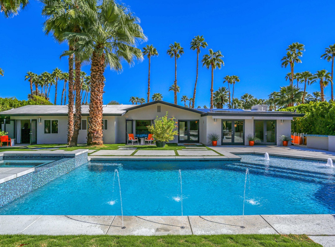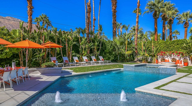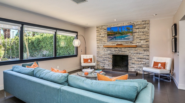 Two of the home’s four bedrooms also open directly onto the pool and spa area for a private resort atmosphere. All bedrooms feature bright, mid-century modern decor, lots of light, and a private TV.