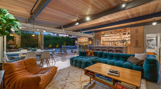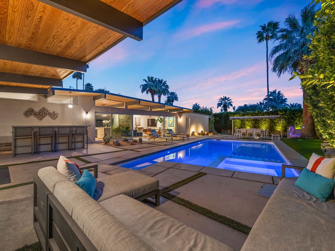 Anchored by the large rectangular ozone pool with integrated spa and tanning shelf, the outdoor spaces feature an outdoor dining room with custom pergola with sliding shade, gas barbeque, fire-pit and abundant chaise lounges, sitting areas and free standing umbrellas. The newest feature to the backyard paradise is a built in bar. This is sure to be the space where guests will spend the most time, enjoying the stunning mountain views and warm Palm Springs sunshine!