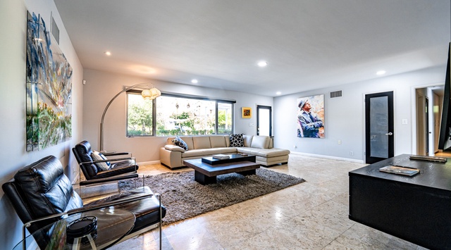 Steps away is an air conditioned living room with a picture window overlooking the front garden. A mid-century modern sectional and club chairs face a large-screen TV.