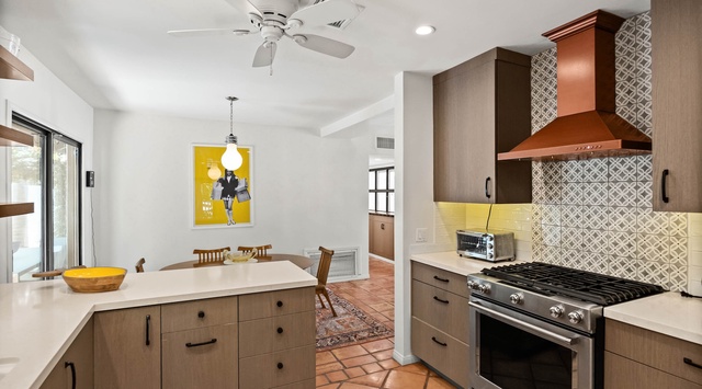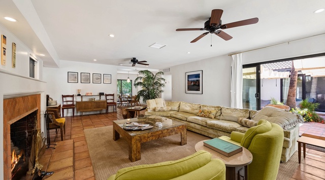 Follow the pathway to the front door of this spectacular home with incredible mountain views and inspiring retro vibes. Guests enter the well-lit living area, complete with a wood-burning fireplace and comfortable furnishings adorned with pops of vibrant green. Discover the Crosley record player and pristine albums on built-in shelves to enjoy timeless music—perfect for dancing! The nearby kitchen showcases high-end appliances and clean white countertops, making meal prep a breeze. A convenient washer and dryer is tucked away in the kitchen closet. Gather around the adjacent dining area's wood table, which seats 5 friends and family. A media room, located off the kitchen, boats 2 recliners, a queen sleeper sofa, a 65" TV, and sliding doors leading to the front patio with an alfresco dining table for 6. After a long day, retire to 3 gorgeous bedrooms— 1 primary with a king bed, 55" TV, designated workspace, private bathroom with a bidet, and a glass slider that leads to the back yard, along with 2 comfy guest bedrooms boasting sizeable queen beds. Enjoy access to the expansive fenced-in back patio via the great room and primary bedroom, where guests can soak up in the sun in loungers before cooling off in the tiled shower and resting under the beautifully draped sunshade with plush outdoor furniture. Splash in the private pool with an attached sitting spa before sitting down to a BBQ dinner fresh off the 4-burner propane grill. It's always a perfect day in Palm Springs paradise!