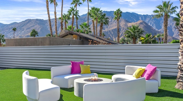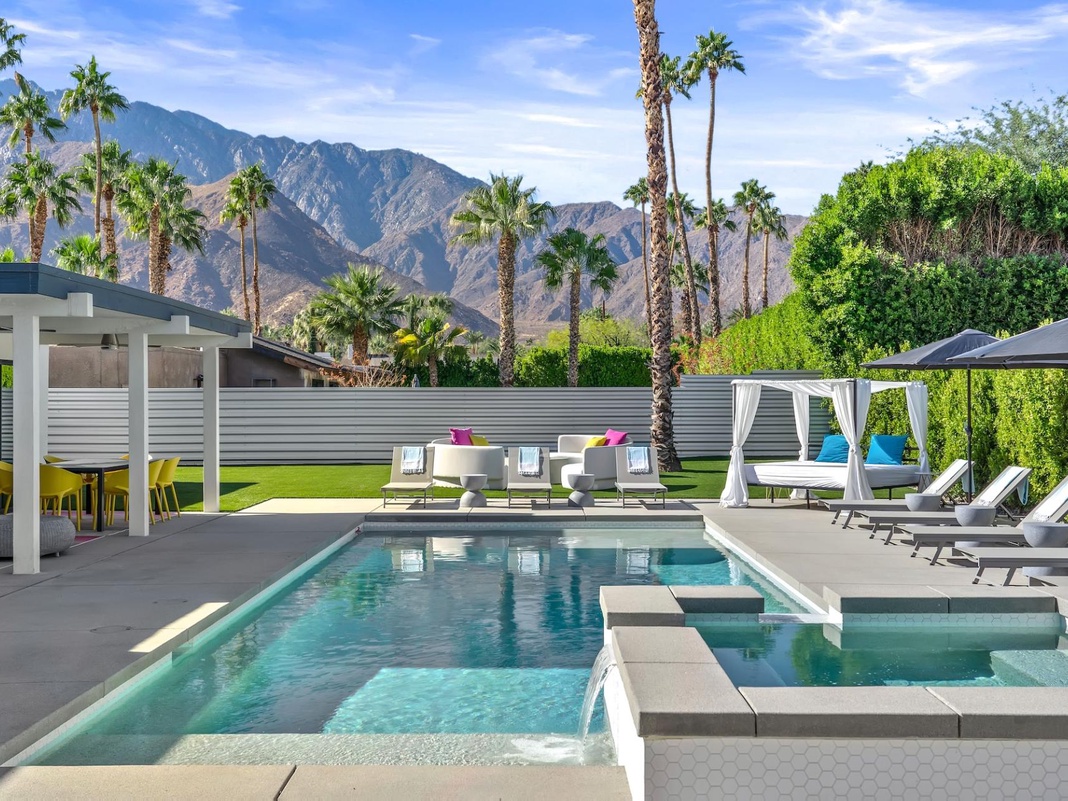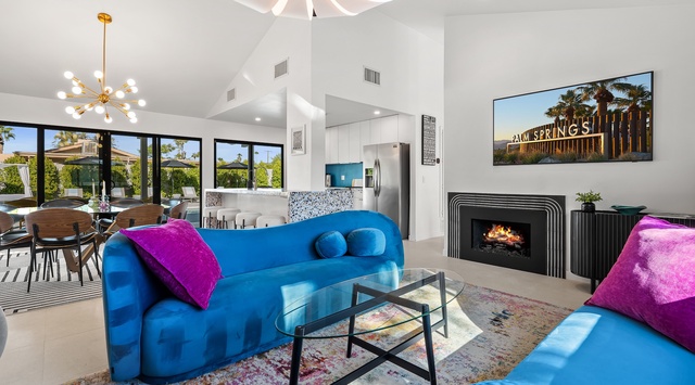 Bright and bold, the interior of this single-story home splashes of colorful hues paired against black and white accents for a whimsical, contemporary design. In the living space, recline on the velvet couches to watch TV or share a bottle of wine with friends while the gas fireplace warms up chilly evenings. The open kitchen, featuring eye-catching terrazzo countertops, has everything guests need to craft multi-course meals or morning mimosas. Up to 8 can dine around the dining table, with 4 additional seats at the breakfast bar. Out the sliding glass doors, discover paradise in the form of a sunlit pool and hot tub, surrounded by views of palm trees and majestic mountaintops. Stretch out for a midday catnap on the umbrella-shaded loungers or the king sized, canopied daybed. Under the pavilion, relax on 2 comfortable couches as the overhead fans offer a lazy breeze. A firepit with comfy seating, a propane grill, and an 8-person table make this idyllic backyard the perfect place to gather day or night! When it’s time to turn in for the evening, guests can retire to the primary bedroom with a king bed, private bathroom, and a slider to the backyard. There are 2 additional guest bedrooms—with 2 queen beds in the first bedroom and 1 king bed in the second. Every bedroom features a TV and beautiful décor and a washer and dryer offer convenience for extended stays.