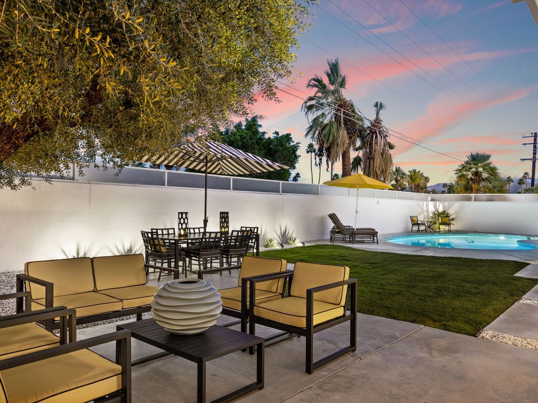 The living room, with its architectural fireplace, is a great gathering space for guests. This room opens up to the back garden of the home, where there is ample, private space for outdoor dining. The sparkling blue pool, spa and lush green grass provide the perfect backdrop for the ideal desert getaway.