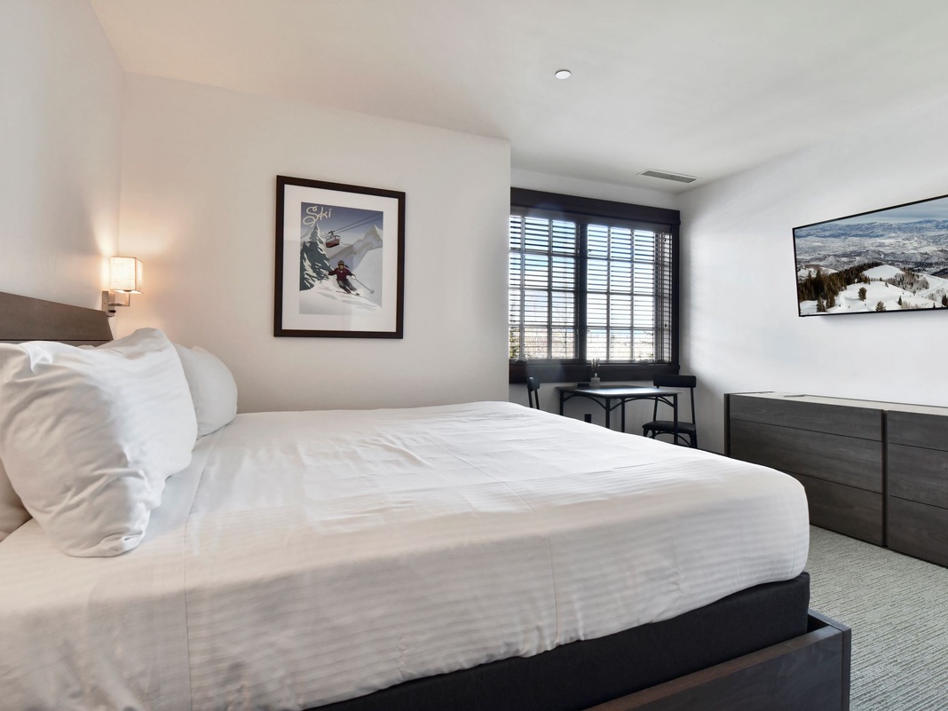 This delightful condo opens into a well-appointed kitchen area, equipped with everything needed for crafting fueling meals to conquer the slopes. Continue into the spacious bedroom area, where a picture window overlooks the mountain. After an adventurous day, sip a nightcap at the 2-person dining set while enjoying the views and peaceful snowfall. A comfortable king bed offers a spot to recharge for the night, or relax and watch TV. The bathroom has high-end finishes and a full-length mirror.