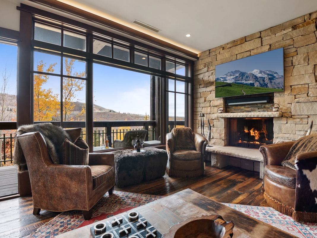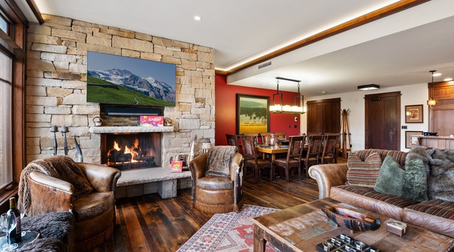 Southwestern style meets rustic coziness inside this beautiful single-story condo, adorned with wood-trimmed windows framing sweeping mountain views and dark hardwood floors. In the living area, a stone fireplace presides over an intimate arrangement of supple leather and cowhide furnishings, creating a lodge-inspired ambiance. Curl up for movies on the TV mounted over the mantel or board games around the coffee table. The gourmet kitchen boasts high-end appliances, granite countertops, and a 3-stool breakfast bar for entertaining friends and family before gathering at the vast 10-seat dining table for a lively group meal. On warm and bluebird days, venture onto the furnished covered balcony for sprawling mountain views and cocktails in the alpine air. A stacked washer and dryer in the hall closet make it easy to refresh clothes for future adventures. At bedtime, enjoy a restful night in the inviting primary or guest bedroom, each featuring a king bed and private bathroom. The spacious bunk room is perfect for kids with 2 built-in XL twin-over-twin bunks and 2 twin trundle beds.