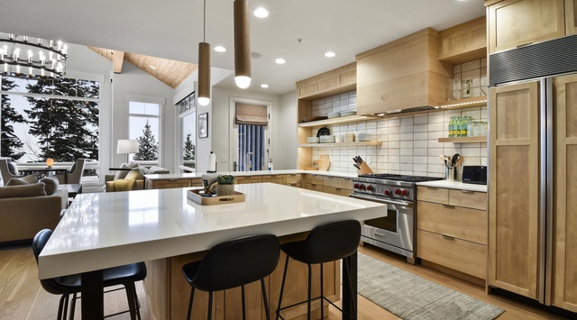 A soaring cathedral ceiling and a vast stone fireplace welcome guests onto the main floor of this charming 3-story retreat. Natural light filters through the expansive picture window in the living space, framing a fairytale view of snow-dusted evergreens. The blend of modern design and subtle mountain aesthetic creates a peaceful atmosphere, encouraging guests to relax on the 2 linen couches with friends and family. Spend the evening enjoying the warmth of the fire or watching the Smart TV. Off the living area is a cozy 6-seat dining room table, with additional bench seating along the wall. A fully equipped kitchen with high-end appliances and a 4-stool island offers a picturesque playground for culinary enthusiasts. By the stairs is a dry bar—perfect for mixing drinks for cocktail hour!