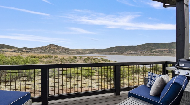 Guests enter this contemporary townhome on the second level, where a palette of pale wood and white walls creates a serene setting for relaxing. The stylish kitchen features quartz countertops, Viking appliances, and an open layout with a 3-seat island/breakfast bar for easy entertaining. There’s plenty of room for dining with a table for 8 to the side. A soaring stone-surround fireplace with a mounted TV invites guests to gather in the living space for chilly nights, drinking cocoa by the fire. On warmer days, barbecue or relax on the attached balcony while taking in the sweeping view of the sparkling reservoir waters below. Off the living area is the stunning primary bedroom with a king bed, Smart TV, private bathroom, and balcony access.