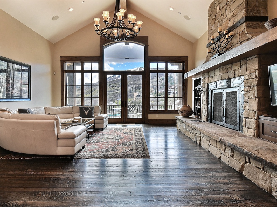 Beautiful hardwood floors and a grand stone fireplace curate a lodge-like atmosphere in the main-floor living area—complete with oversized windows showcasing the stunning mountain views! Sink into the curved sectional sofa to watch TV or venture onto the wraparound deck furnished with a 4-person patio table and gas grill. The gourmet kitchen offers high-end Viking appliances and a 4-stool breakfast bar. There’s also an 8-seat dining table for group meals. When nighttime falls, recharge in the spacious primary bedroom, featuring a king bed, sitting area, private fireplace, TV, and private deck access.
