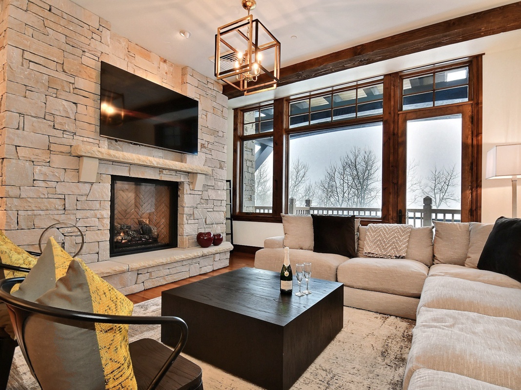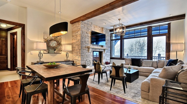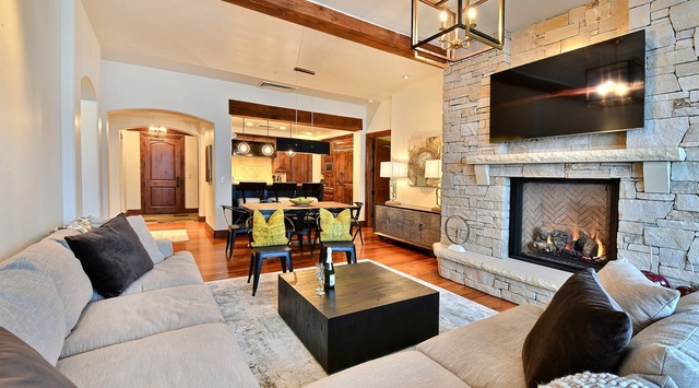 Inside this cozy condo, discover a charming, open great room featuring gleaming hardwood floors, a beamed ceiling, and an over-sized stone fireplace. Food lovers will be delighted with the gourmet kitchen’s Viking appliances, including a 6-burner stovetop with a griddle for crafting large group brunches before hitting the slopes. There’s space for 6 to dine at the table, with 3 additional seats at the breakfast bar. Sink into the sumptuous and spacious sectional for a night staying warm by the fire or streaming a favorite movie on the 64” Samsung TV. Out the adjacent door, indulge in a nightcap on the balcony while taking in the mountainous landscape. A convenient washer and dryer ensure gear is ready to go for the next adventure. When bedtime arrives, slip away for a tranquil evening in the primary bedroom with a king bed, gas fireplace, TV, and private bathroom. There is 1 guest bedroom with a king bed, a private bathroom, and a TV. The kid-friendly bunk room includes a twin-over-full bunk bed, a twin bed, and a TV.