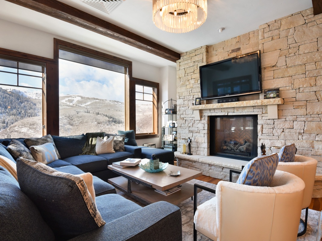 Slip inside this single-story retreat to discover a bright and welcoming living, kitchen, and dining space seamlessly connected with rich hardwood floors and a timber-beamed ceiling. Numerous picture windows frame views of the nearby slopes and let in an abundance of natural light. In the living space, a cheerful blue sectional and 2 barrel chairs sit before the stone façade fireplace—tempting guests to enjoy drinks and conversation in the firelight. On the other side of the room, a chef’s kitchen with granite countertops, Viking appliances, and a 4-seat breakfast bar is fully equipped for whipping up everything from multi-course dinners to grab-and-go snacks. A live-edge dining table with 4 chairs and a bench offers seating for meals. By the sliding glass door, a pair of chairs look out to the balcony, which hosts a 2-person cafe set and mountain views. When night falls, there is 1 primary bedroom with a king bed, private bathroom, TV, Blu-ray player, gas fireplace, and balcony. Guests can also retire to the 2 guest bedrooms with private bathrooms and TVs that have a queen bed and king bed, respectively. Additionally, there’s 1 kid-friendly bunk room with a twin-over-full bed, a twin-over-twin bed, and a TV.