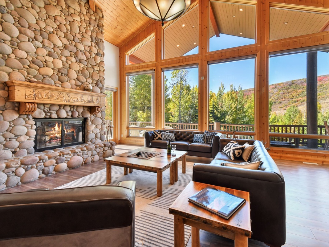 A spacious main-floor great room welcomes guests into this 3-story home, capturing the cozy atmosphere of a ski lodge. The pièce de resistance is the grand spiral staircase that leads to the top floor, as well as the floor-to-ceiling stacked stone fireplace. The living area, with a soaring 2-story ceiling, is well-lit from the wall of windows and offers comfortable leather furniture and a TV for entertainment. The traditional dining area seats 10 people, while an additional table adjacent to the kitchen can seat 6. Equipped with high-end appliances, ample cabinet space, and a stunning island that seats 6, the gourmet kitchen is perfect for cooking and casual meals. Enjoy access to the second-floor deck with ample seating, a sizzling pizza oven, and jaw-dropping alpine views. Guests can retire to the 3 bedrooms on this floor—2 guest bedrooms with queen beds and 1 guest bedroom with a king bed.