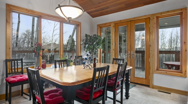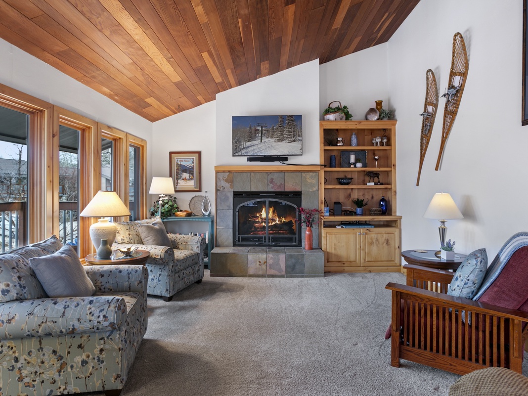The warm glow of natural light streaming through large windows greets guests inside this stunning 2-story condo. The wood panel ceiling in the great room adds a touch of rustic charm while plush furnishings beckon guests to sink in and relax. Curl up around the gas fireplace on 3 inviting armchairs and a comfortable couch, or host a movie night with the TV mounted overhead. When hunger strikes, whip up a quick bite in the fully equipped kitchen, complete with high-end appliances, granite countertops, and designer cabinets. Pull up a stool at the 4-stool breakfast bar or gather around the traditional dining table with seating for 6-8 people. On sunny days, step onto the spacious back deck and take in the fresh air while enjoying alfresco dining or lounging on the many seats.