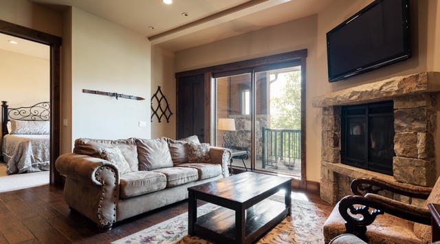 Dark wood and rustic stone features create a cozy and welcoming environment in this 2-story townhome. Guests who prefer homemade meals will appreciate the high-end Viking appliances and granite countertops in the open kitchen. Gather at the 3-seat breakfast bar to go over the day’s adventures while sharing a glass of wine. For formal meals—or an exciting game night—there is a 6-person dining table. When it’s time to sit back and relax, the living space’s plush sofa, 2 armchairs, TV, and stone fireplace beckon. Step out the sliding glass door for epic views of the mountainous landscape from the balcony. For convenience, there is a stackable washer and dryer near the kitchen. A guest bedroom with a fireplace, TV, and balcony is off the living space.