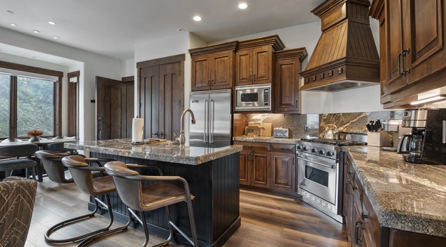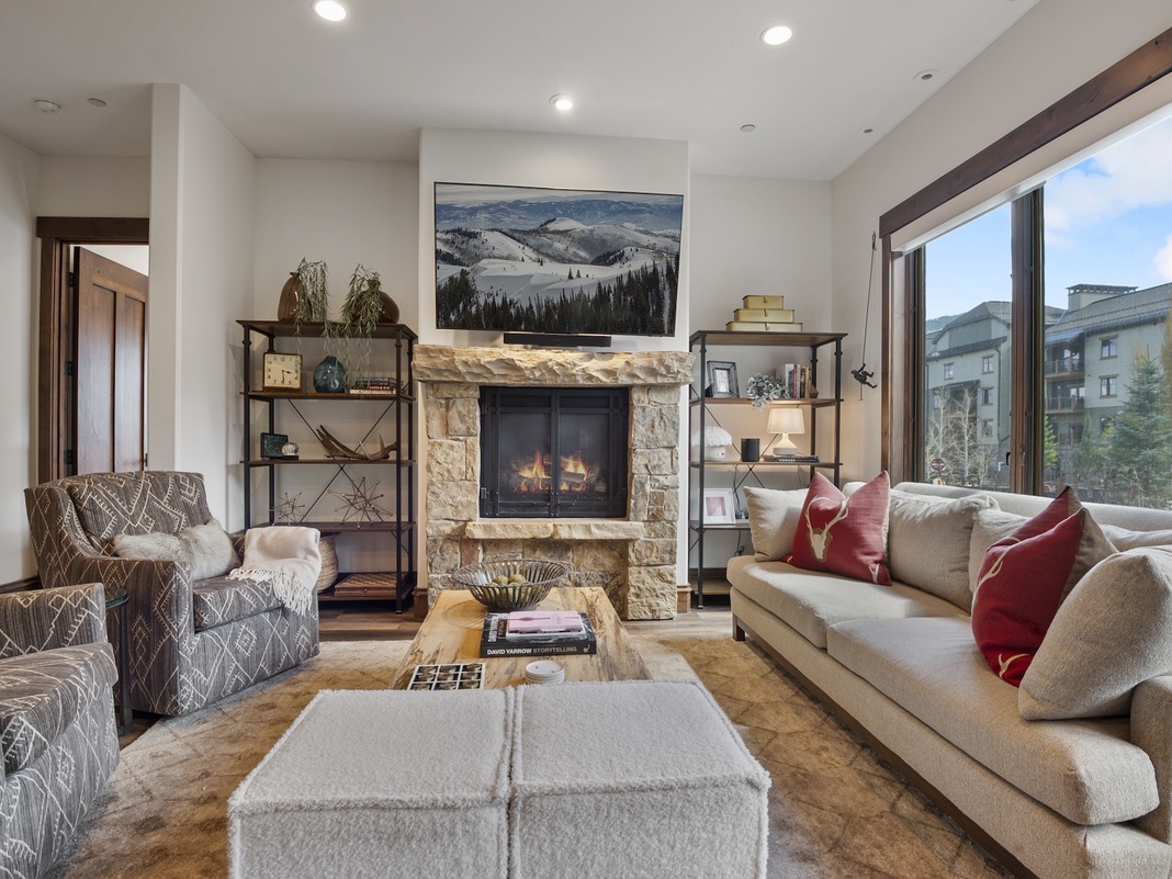 Cozy ambiance and natural light fill the combined living, dining, and kitchen space inside this 2-level townhome. Warm multi-toned wood floors and a rough-hewn fireplace add a picturesque mountain aesthetic. Sink into the soft sofa and 2 armchairs to chat about the day’s fun or unwind with a movie on the 60” Smart TV and Sonos soundbar. When hunger strikes, the fully equipped kitchen boasts Viking appliances, a slow cooker, blender, and everything guests need to make meals or snacks. By the wood-trimmed window is a sunlit dining nook with banquette seating and 2 chairs to seat 6. Extra seating can be found at the 4-stool breakfast bar. End the night in the restful primary bedroom with a soft king bed and 55” TV—all the bedrooms have a private bathroom and gas fireplace! For convenience, there is a washer and dryer on this level.
