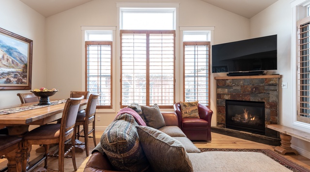 Enter into the heart of Little Empire on the inviting third floor, designed for comfort and style. The open floor plan boasts knotty hickory hardwood floors, vaulted ceilings, and a cozy gas fireplace. Sunlight streams through large windows, offering stunning Park City views. Gather with friends and family around the small gas fireplace with a 55" TV overhead, where a comfortable couch and armchair await in the living area. Share meals at the 6-seat dining table, ideal for family gatherings, or grab a quick bite at the cozy 2-seat breakfast bar. The chef's kitchen boasts expansive granite countertops, elegant wood cabinetry, and top-of-the-line appliances, including an electric cooktop and oven. A mudroom with storage and a bench, plus a washer and dryer nearby, adds convenience for outdoor enthusiasts.