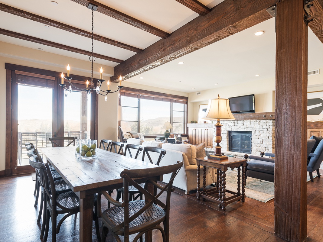 Discover a quaint retreat inside this single-story condo. Dark wooden beams and a stone fireplace contribute to an idyllic cottage atmosphere, inviting quiet nights spent around the flickering fire. Out the picture window, snow-frosted evergreens dot the mountain peaks. Curl up on the soft couch or any of the comfy armchairs with warm mugs of cinnamon-spiced wine and cider for a movie night on the 65” TV. Gather in the morning for a lively brunch at the 10-person dining table before heading out to hit the slopes. The stylish kitchen features high-end Viking appliances and an open layout with a 4-person breakfast bar that lets conversation flow throughout the great room. Slip outside to barbecue on the natural gas grill or savor the fresh mountain air from the private hot tub on the balcony. As the evening winds down, choose between 2 guest bedrooms boasting king beds or the bunk room with 1 full bed and 1 twin-over-twin bed, all with private bathrooms.