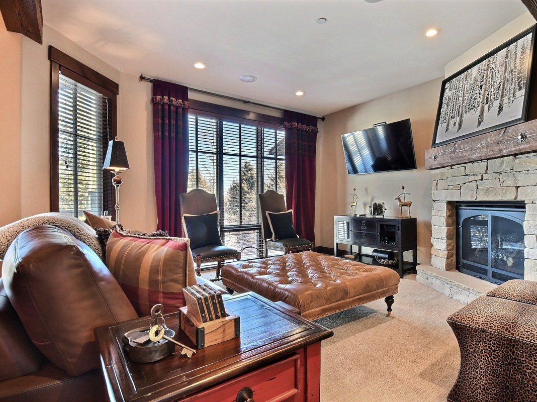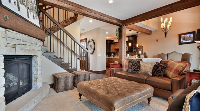 Rich, dark wood beams and a stacked-stone fireplace add warmth and character to this delightful 3-story condo’s main floor. Curl up on the soft couch and indulge in a quiet evening catching up with friends or streaming a movie on the 55” Smart TV by the roaring fire. Around the corner is the large kitchen, featuring stone countertops and high-end appliances for crafting meals to refuel after a day on the slopes. Settle around the 5-person dining table for dinner, with additional seating for 2 guests at the nearby breakfast bar. After, savor the fresh air with a nightcap on the covered balcony furnished with a grill and a patio table. Feel free to pack light—there’s an in-unit washer and dryer. When it’s time to turn in for the evening, a charming bunk room with a log twin-over-full bed, a private bathroom, and a TV is on this level. For extra accommodations, the living area has a queen sleeper sofa.