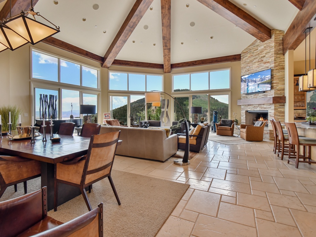 Continue to the third level’s impressive 2-story great room adorned with striking beamed ceilings, colorful modern artwork, and floor-to-ceiling windows framing dramatic mountain views. Relax by the stone fireplace or watch a movie on the 80” TV—2 sofas and an arrangement of comfortable club chairs offer plenty of seating for the group! The enormous kitchen is equipped with top-of-the line appliances and an open layout for seamless conversation between spaces. Up to 10 guests can dine at the formal dining table, with 4 extra seats at the breakfast bar. After dinner, grab a bottle of wine from the chiller and enjoy a nightcap on the balcony.