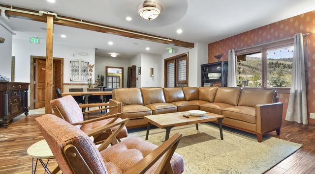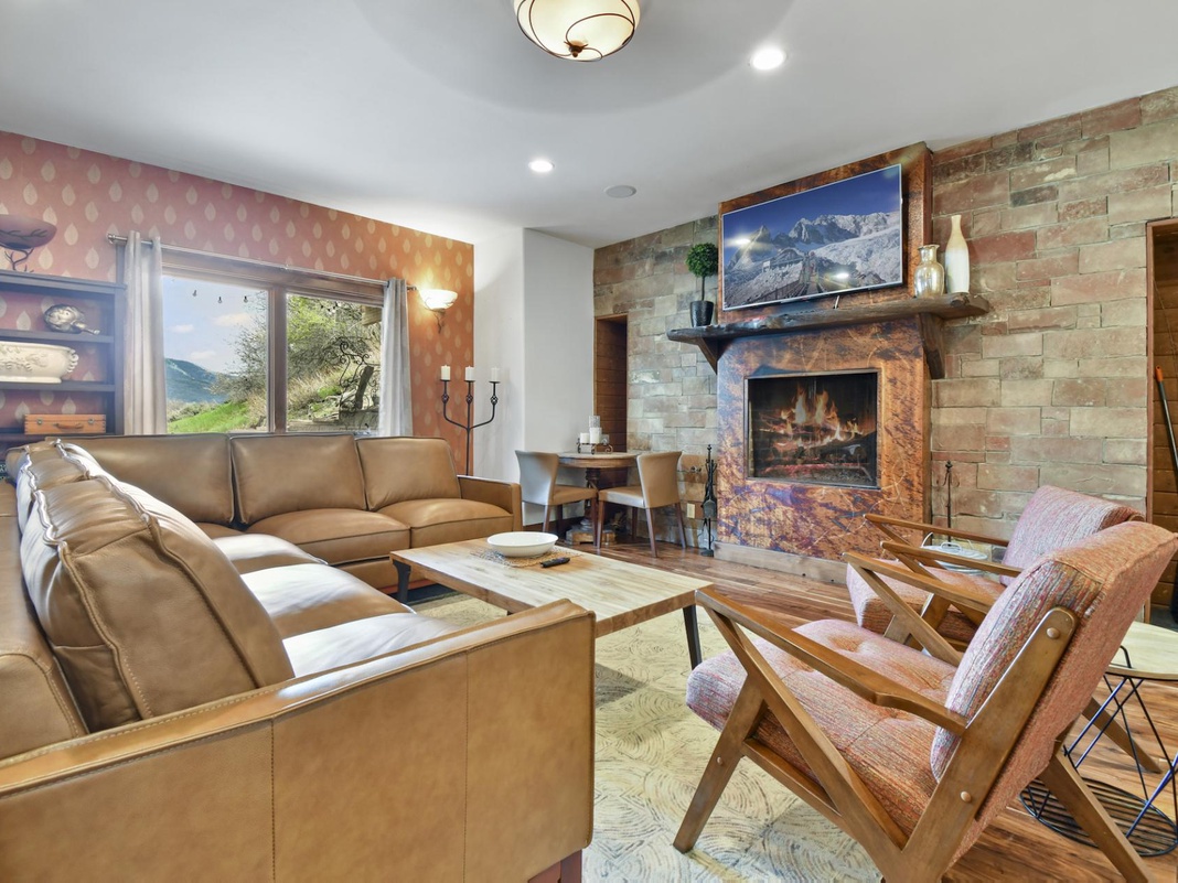Upon entering the main floor of this exquisite mountain home, guests are welcomed by the warmth and beauty of dark wood flooring, along with a stone accent wall featuring a mounted TV and fireplace. Host loved ones in the living area with a large leather sectional and a small work area. Behind the sofa lies a wet bar ready for hosting happy hours or après ski drinks. Enjoy meals in the adjacent dining area with a traditional table that seats 10. Plus, a round table with 4 chairs provides additional seating in the living room. The French doors off the dining area lead to an outside furnished deck with gorgeous mountainscapes. The thoughtfully designed kitchen features an expansive island bordering the 4-stool breakfast bar and commercial-grade appliances. This level also offers 2 bedrooms—1 primary bedroom with its own fireplace and 1 guest bedroom with a versatile bathroom that provides an ADA-compliant shower with built-in seating for maximum comfort. There’s also private ski storage with lockers for added convenience.