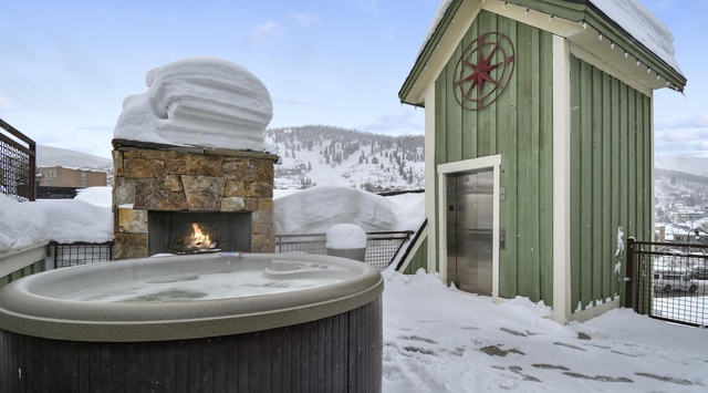 The top floor boasts 1 guest bedroom with access to a rooftop deck with a private hot tub next to an outdoor fireplace.