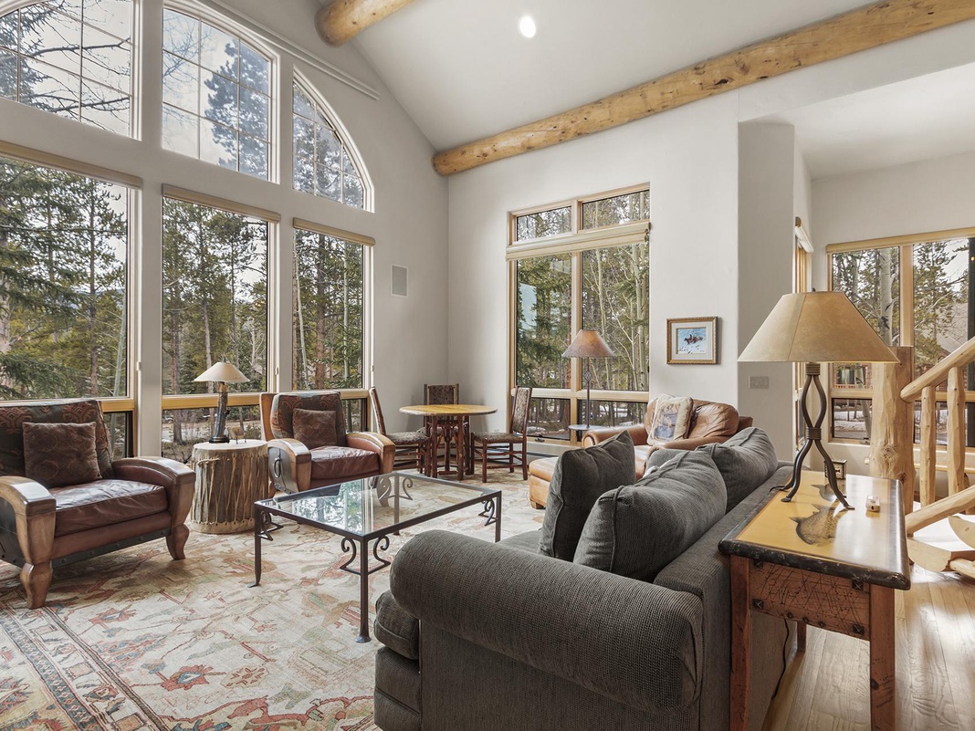 Pale, hewn logs add a rustic yet refined feel to this 3-story home’s beautiful interior, equipped with radiant heating and a Sonos sound system throughout for comfort and entertainment. The main level opens into an elegant second-floor living area with a gorgeous oversized picture windows surrounded by soft seating and a 2-person table for games or puzzles. Up a few more steps and past the dining table for 8 is the U-shaped kitchen featuring a 2-stool island, wraparound windows, and a 4-burner gas range. A comfortable living space to the side has exposed beams, a leather sofa, and cushioned chairs. Curl up with hot cocoa or a glass of wine before stepping outside to admire the wooded views from the attached back deck with a grill, 6-person table, and private hot tub. This level has a guest bedroom with a queen bed and back deck access.