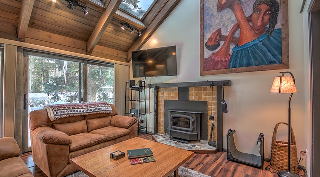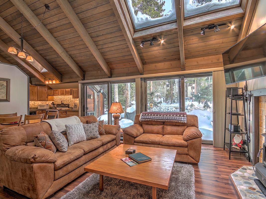 Venture up to the main level to find a warm and welcoming great room. Large skylights, wood floors, and a tongue-and-groove ceiling curate an intimate mountain setting. Sink into the living area’s soft suede sofas to wind down the night watching TV or relax in front of the fireplace. An adjacent sitting room offers room for kids to play or extra space to gather. The cottage-style kitchen has everything guests need to prepare delicious meals or on-the-go snacks, and there’s seating for 6 at the dining table. A stacked washer and dryer make it easy to keep gear fresh for the next day’s outing. On bluebird days and during warmer months, venture out the sliding glass doors to grill on the back deck or drink in the scenic view with a nightcap.