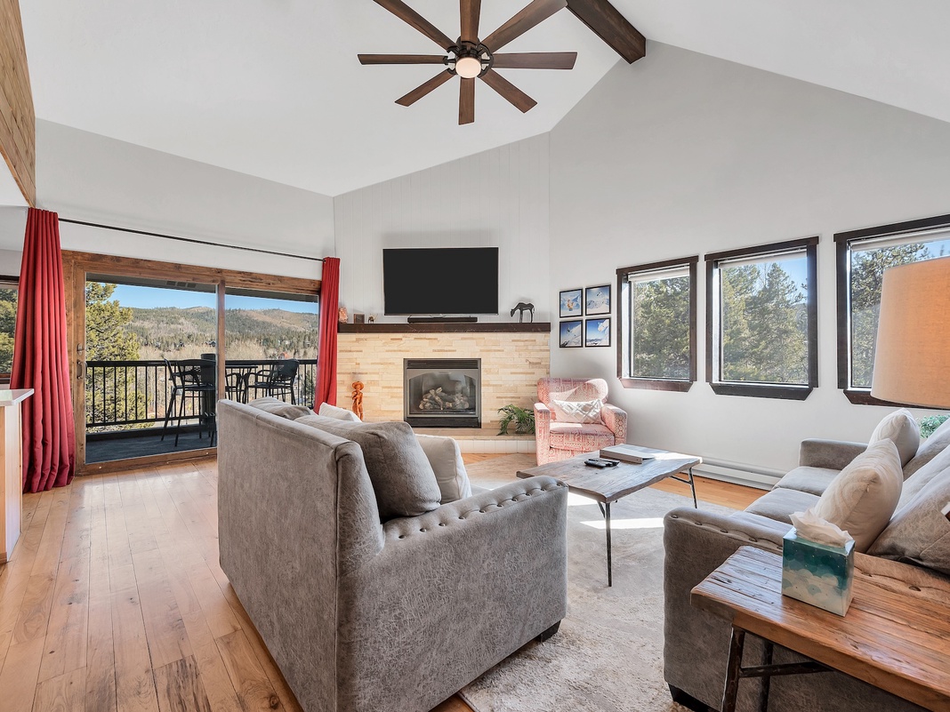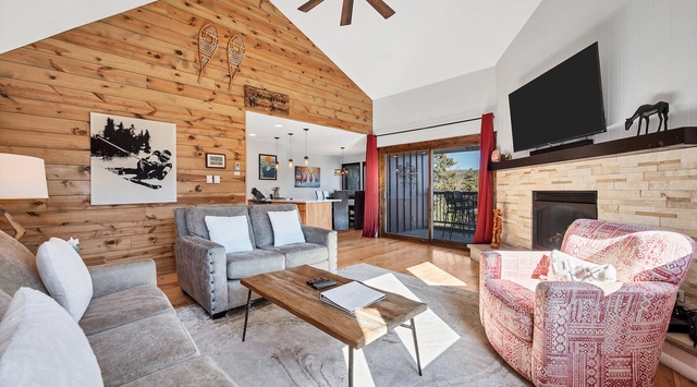 A well-equipped entryway, complete with hooks and a bench, welcomes guests to this delightful condo. Slip off boots and jackets before following the hardwood floors into the sunlit living space, set beneath a soaring vaulted ceiling. Picture windows and sliding glass doors frame the surrounding foliage and mountain peaks, while an accent wall of natural wood pairs with the mountain décor, adding a rustic touch to the modern setting. A plush couch, loveseat, and armchair beckon guests to sit back, watch TV, and enjoy the fireplace’s warmth. Out the sliding glass doors, find the expansive balcony with a high-top table for 4—the ultimate spot to sip a drink and savor the mountain view. Around the corner, the room flows into the open kitchen, boasting plenty of counter space, including a 3-stool breakfast bar where guests can keep the chef of the group company over coffee or cocktails. A round dining table with 4 chairs and a bench offers seating for formal meals, with views of the mountains. In the primary and guest bedrooms, log furnishings add mountain ambiance as guests unwind for the night. The former contains a king bed, while the latter features a queen bed and a twin bed. A sleeper sofa in the living area provides additional sleeping accommodations.