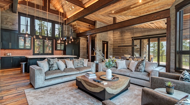 A sunlit foyer with hardwood floors, bench seating, and a chic chandelier welcomes guests inside this immaculate 3-story home. Custom-built with textured wood walls, exposed log beams, and vaulted tongue and groove ceilings, the glorious 2-story great room showcases an impressive wall of windows that reveal a wraparound deck and stunning mountain views. Unwind on 2 lavish full-length sofas and a pair of club chairs, where the warm fireplace and 70" TV create an ideal setting for movie nights. Steps away, the expansive dining area seats 8 with accordion sliding glass doors, creating an inviting indoor/outdoor ambiance with great views. The gourmet kitchen dazzles with marble countertops and high-end appliances, featuring a Miele coffee machine, Wolf 6-burner stove, wine fridge, and free-standing ice maker. Easily retire to the main-floor guest bedroom with a king bed, fireplace, private deck entrance, private bathroom with soaking tub, and stacked washer and dryer in the closet. Located off the garage, a ski storage with benches, hooks, ski lockers, boot warmers, and a laundry area facilitates a seamless outdoor and indoor transition.