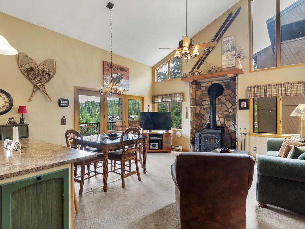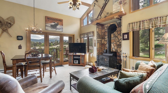 A rustic stove fireplace, plaid accents, and mountain décor offer classic alpine charm inside the welcoming great room. The fully equipped cottage-style kitchen features an open layout and a breakfast bar for 2 that overlooks the 4-person dining table and living area. Curl up on the soft green couch and leather armchair for an evening of card games and conversation. A TV in the corner makes it easy to enjoy group movie nights anywhere in the great room. Off the dining area is a deck where guests can enjoy stunning views of the Continental Divide and the Breckenridge Ski Resort. The first floor is home to a bunk room with a twin bed and a twin-over-full bed. For additional sleeping accommodations, the great room has a queen sleeper sofa. A washer and dryer offer convenience for extended stays.
