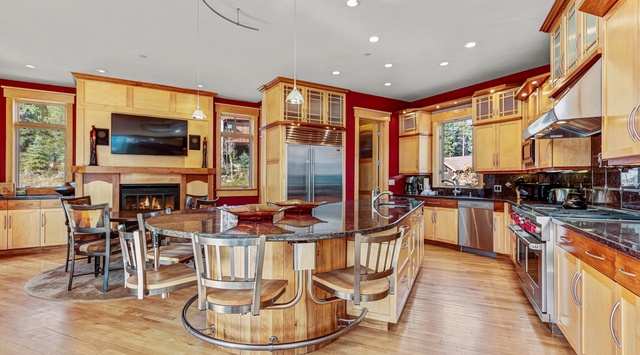 On the main level, an open-concept great room provides ample space for guests to gather. Soaring windows by the gas fireplace frame the stunning mountainscape. Curl up on the couches and armchairs and sipping marshmallow-topped hot chocolate or cocktails mixed at the wet bar. The gourmet kitchen is a chef’s dream with a Wolf 6-burner stove and a curved kitchen island that seats 5. There’s plenty of dining space with a 4-top table by the kitchen’s gas fireplace, a table that seats 8 beneath the picture window, and a 6-seat table on the attached deck. This floor has 2 guest bedrooms with private bathrooms—the first bedroom has a king bed and the second a queen bed. A twin daybed with a twin trundle in the sunroom offers extra sleeping options.
