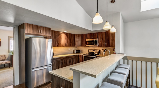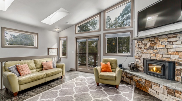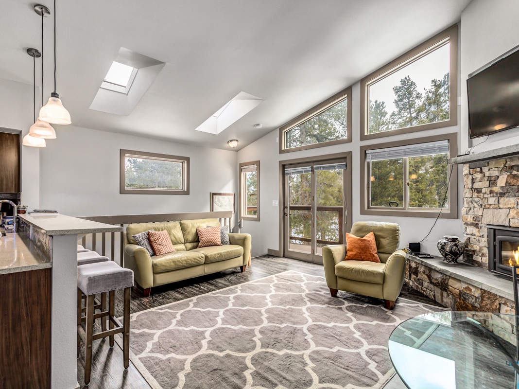Head upstairs to discover a bright, open-concept living area with soaring ceilings and skylights for added natural light. Off the living area is a fully equipped kitchen with high-end appliances and a 4-stool breakfast bar. An oversized loveseat, reading chair, and 2-seat cafe table offer plenty of room for gathering with friends and family. The 55” Smart TV, mounted above the cozy, stone-facade fireplace, beckons guests to unwind with a movie or favorite show. Slip out the glass doors to the balcony with 2 chairs and striking mountain views—the perfect spot to bask in the crisp alpine air. When evening falls, retire to the elegant primary bedroom with a queen bed and a private bathroom on this level.