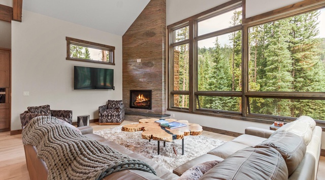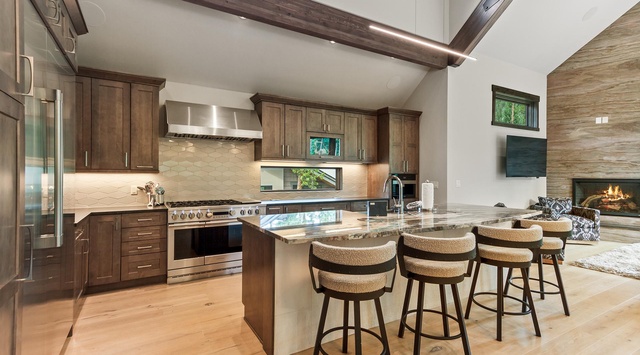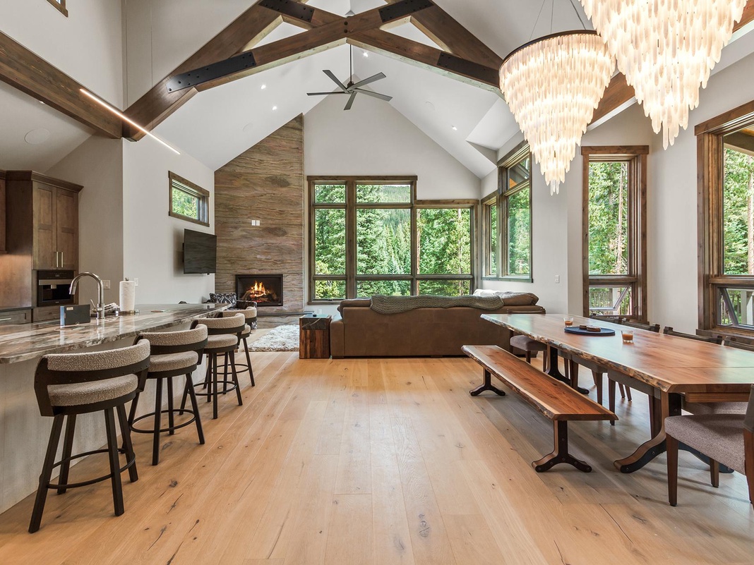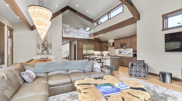 Upon entering the second floor of this remarkable home, an aura of rustic elegance makes visitors feel immediately at home. The soaring cathedral ceilings, adorned with exquisite wood beams, seamlessly complement the modern décor. Outfitted with premium appliances, the luxurious kitchen features a 6-burner gas stove, a side-by-side refrigerator and freezer, and a dishwasher. Use the coffee grinder and brewer to prepare morning java while discussing the day's plans at the 4-person breakfast bar. A nearby dining area comfortably seats 10 and provides direct access to the outdoor deck. After a day on the slopes, warm up on the leather sectional in front of the gas fireplace and 76" TV. When night falls, choose from 2 comfy bedrooms on this floor—including 1 primary bedroom with a king bed, fireplace, and soaking tub in the private bathroom and 1 guest bedroom with a king bed and private bathroom.
