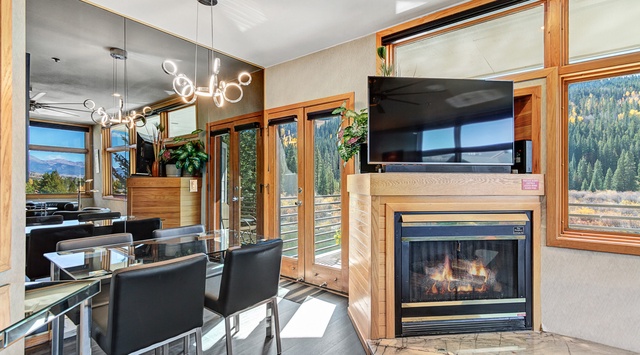 Two walls of picture windows in the living area reveal close-up ski slope views and a spectacular view of Buffalo Mountain. All of this sits over eight acres of tranquil and active beaver ponds, which create marshlands full of wildlife—moose, deer, elk, foxes, muskrats, all forms of water foul, and of course, beavers. Beyond the ponds is an unobstructed view of Dercum Mountain. A chic leather sofa and twin leather club chairs face a cozy gas fireplace and 4K Smart TV at one end of the room. At the other, a 4-seat dining table sits by a full-length mirror, with mountain views through French glass doors leading to the large furnished deck with southern exposure, partially shaded by pine trees. April through October is the most active time to view the wildlife.
