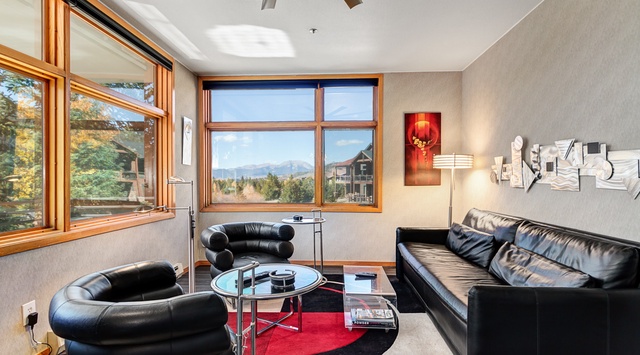 Newly updated throughout, it’s styled in 1920s minimalist modern decor with glass and chrome accent furniture and bold artwork. The single-level romantic condo combines the coziness of an alpine lodge with the ambiance of an upscale hotel, with arguably the best views available in River Run.