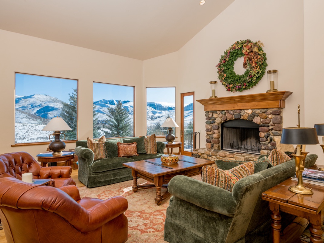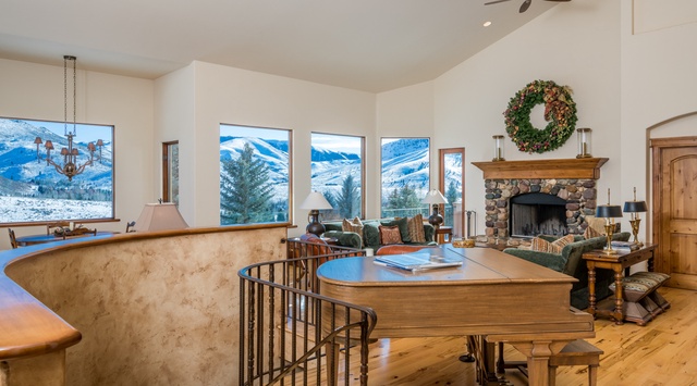 Beneath tall ceilings, the rich grain of hardwood floors and the rustic charm of a river-rock fireplace coalesce to create the warmth and grandeur of a Western lodge, while large picture windows transform the space into a serene observatory with beautiful vista views. A haven for conversation and relaxation, the great room welcomes guests in with a duo of plush, emerald-hued sofas and matching leather armchairs—an elegant grand piano provides classic entertainment for the main floor. Steps away, an exquisite gourmet kitchen, adorned with high-end appliances, including dual ovens and dishwashers, stands ready to inspire home-cooked feasts for large gatherings. The breakfast bar seats 2 near the wine fridge, providing an intimate setting for socializing or hosting a private chef. An elegant dining space comfortably accommodates 10, while the separate kid-friendly brunch table seats 4. Extending off the great room is a spacious deck, overlooking the yard below, where kids can play tag on warm evenings, all within view of adults preparing dinner on the gas grill overhead. An entertainment room provides the idyllic space for family movies nights with comfy couches and a warm fireplace. Two lavish bedrooms on this floor radiate comfort and style, with the primary boasting a private fireplace and deck with magnificent views.
