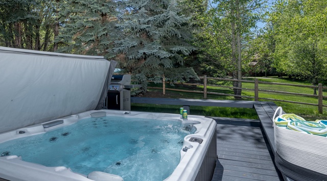 This stunning 2-story vacation home is perfect for gathering with friends and family. With ample space to spread out and relax, the entryway living area boasts tall ceilings, gorgeous natural lighting, and a cozy fireplace. A secondary living space provides a plush couch and leather rocking chair around the TV and fireplace. Movie lovers will adore the large TV and sectional couch in the dedicated TV room. The gourmet kitchen is fully equipped with high-end appliances and stylish cabinetry. Cook like a pro with the Bosch steam convection oven and enjoy breakfast at the 4-stool breakfast bar. An 8-seat dining table provides the best spot for a sit-down meal, while the 4-chair table is excellent for a quick bite. Treat friends to a drink from the wine refrigerator at the separate wet bar off the kitchen. When it's time to relax, step outside to the expansive deck, soak in the hot tub, or savor a meal grilled to perfection at the alfresco dining table. Retreat to the inviting guest bedroom on this floor with a cozy queen-sized bed and shared bathroom. There's also a laundry room for convenience.