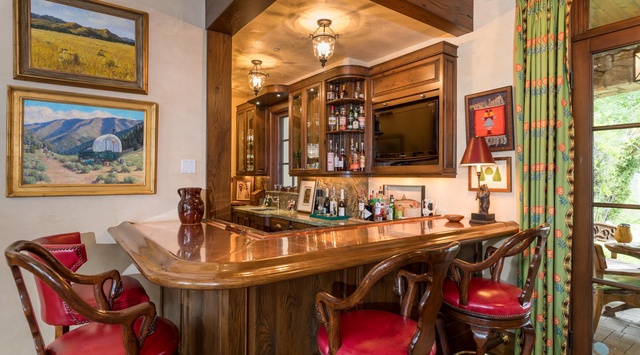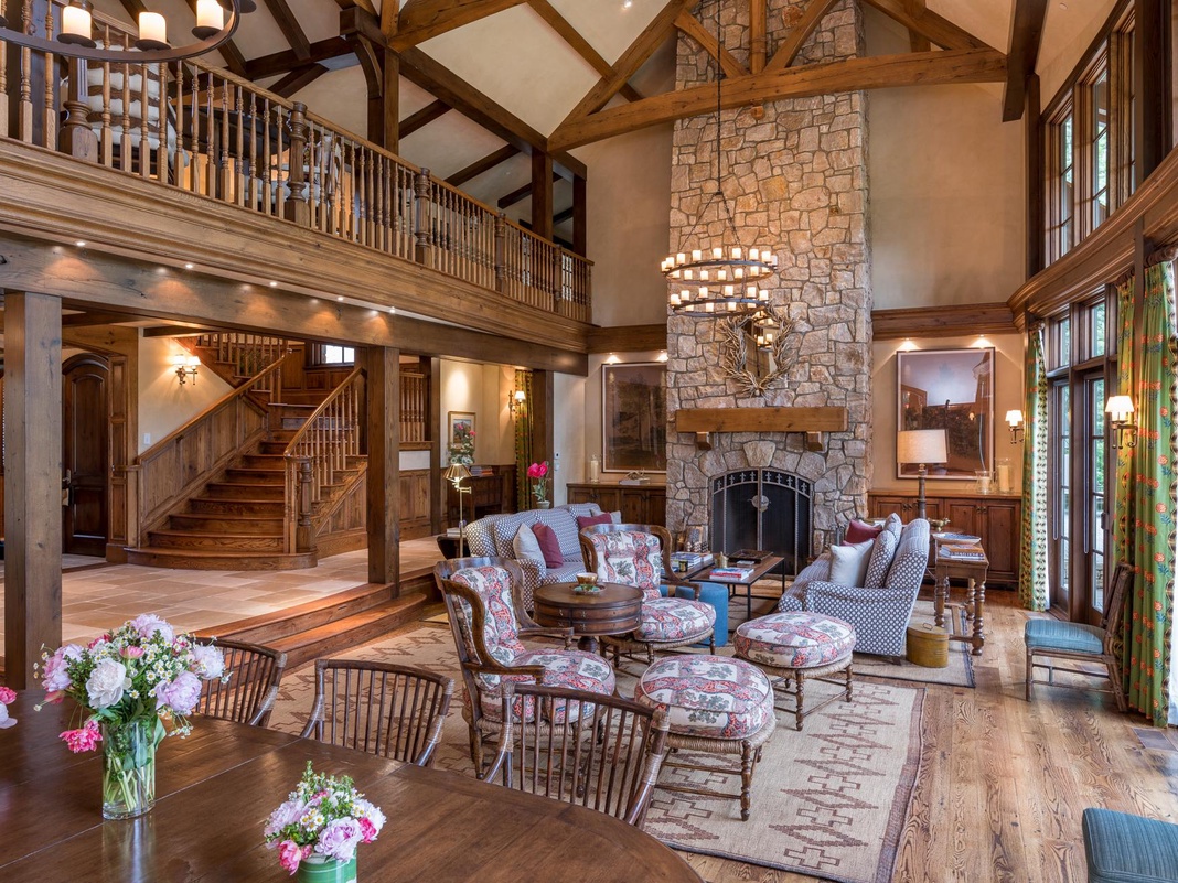 Up the ornate staircase, 3 elegant guest bedrooms await, each with a queen bed, TV, and fireplace—the first bedroom also has a private balcony with lake and mountain views. Kids and young adults will delight in the spacious media room equipped with an enormous sectional, cozy fireplace, TV, wet bar, a table for 6, and attached to the bunk room with 2 twin-over-twin beds.