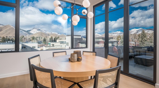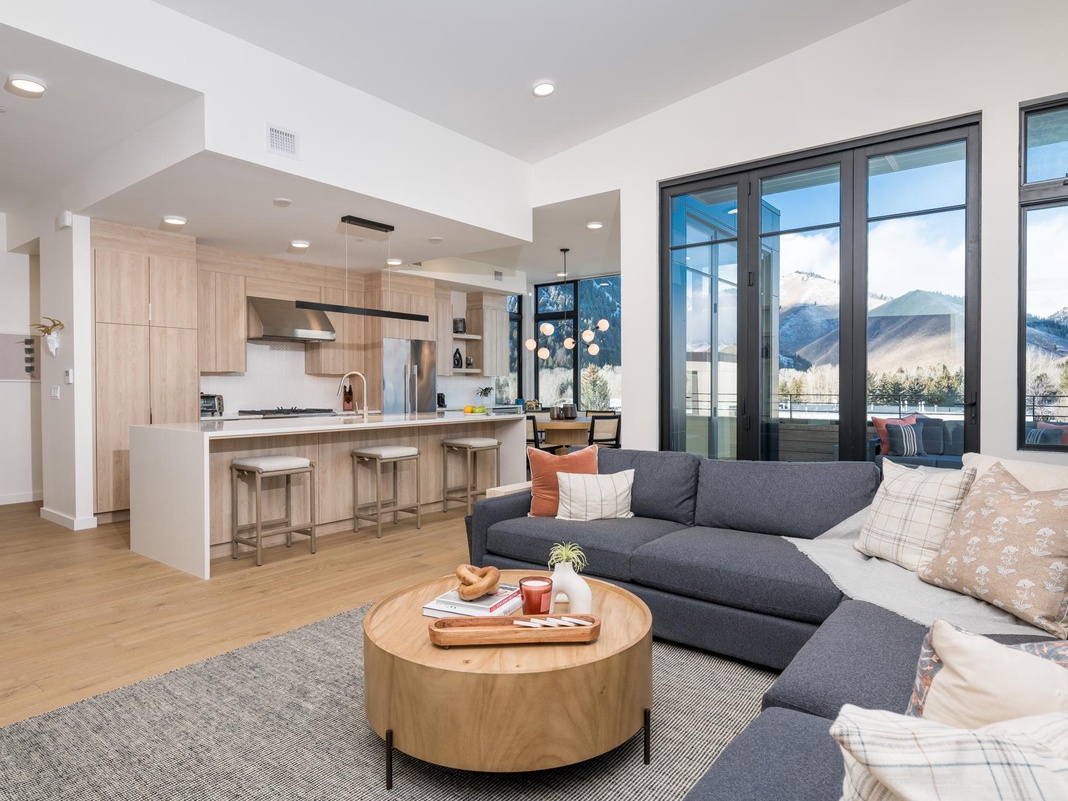 An expansive wall of windows in this single-story townhome frames the natural beauty of the Sawtooth Mountains while enveloping the space with natural light. A spacious open floor plan allows friends and family to communicate seamlessly between spaces. The TV-facing living area provides all the comforts of a home with an oversized sectional couch to sink into while warming up next to the gas fireplace for movie night. There's even a remote workstation with a desk and chair for convenience. Continue into the gourmet kitchen, where guests can cook with delight on the top-of-the-line appliances after chopping veggies on the sizeable island with built-in appliances. The adjacent dining area seats 6 around a circular table, while the breakfast bar seats 3 more. For Winter sports enthusiasts, the mudroom provides bench seating to take off boots, hooks to hang ski jackets, and a stacked washer and dryer to keep everything fresh, clean, and dry. Enjoy access to the balcony from the great room with plush outdoor furniture, a firepit, and breathtaking views. When it's time to unwind and head to bed, guests can choose from 3 luxurious bedrooms—1 guest bedroom with a queen bed and private bathroom, 1 other equally as inviting guest bedroom with a king bed, and 1 primary bedroom with a king bed, private bathroom, and access to a private deck with Dollar Mountain views. The perfect getaway!