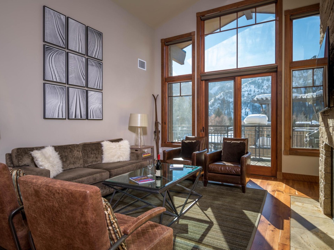 Ascend to the third floor via the elevator and step into the heart of this exquisite 2-story penthouse, where an amalgamation of modern mountain décor and mid-century-inspired accents punctuate the space. Effortlessly merging the living, dining, and kitchen areas under vaulted ceilings, the great room provides sweeping Bald Mountain views extending onto the quaint deck. Bathed in natural sunlight from an impressive wall of windows, a soft, velvety sofa adorned with white fur throw pillows forms a cozy gathering space, surrounded by 4 sleek leather chairs in the living area. Overhead, a 9-panel black-and-white polyptych of groomed cross-country tracks hangs opposite a large stacked-stone wall with a gas fireplace and 50" TV with surround sound, emphasizing the room's minimalist vibe. The formal dining area houses a country-style banquet table that can seat up to 10 for sit-down dinners, with an additional trio of seats at the breakfast bar for casual bites. The gourmet kitchen, fully equipped with commercial-grade appliances like a Subzero refrigerator and 6-burner gas stovetop, features granite countertops and ample counter space—perfect for home-cooked meals or a hired chef. Steps from the great room is a delightful bedroom styled in classic white décor, which invites guests to unwind in luxury.