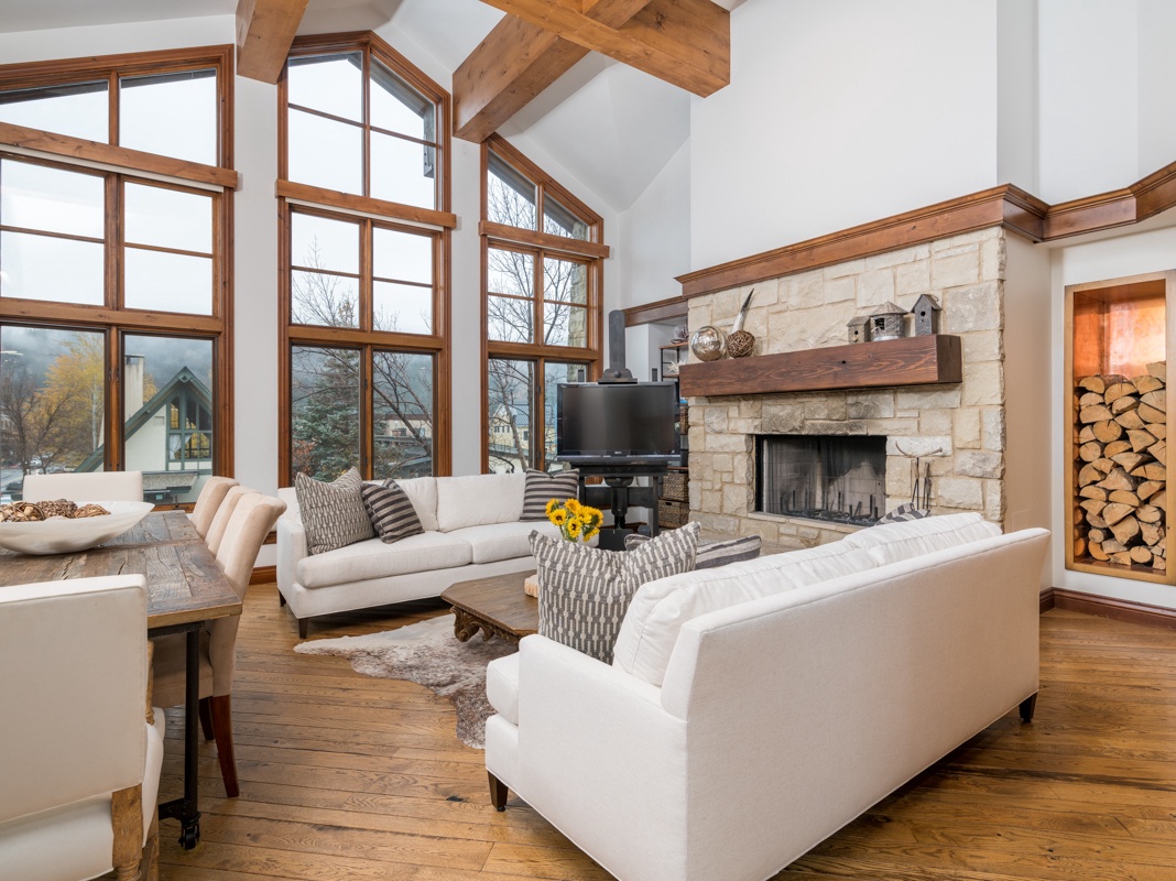 An inviting entryway with hooks, a bench, and a rawhide chair welcomes guests into this stunning retreat. Head into the bright and airy great room, with double-height ceilings and hardwood floors, accented by a striking beamed ceiling. Cushioned bench seating lines the 2 walls of full-length windows, offering views of the town and surrounding mountains. Framing a wood-burning fireplace are 2 comfy sofas, where guests can get lost in a book or unwind with a movie on the Smart TV. Next to the formal living area, a distressed wood dining table seats 6, with 4 additional seats at the breakfast bar. Guests with culinary inclinations will appreciate the fully equipped kitchen’s high-end appliances and open layout for effortless entertaining. On cool Summer nights, venture out to the spacious private deck overlooking the mountains to dine alfresco at the 6-seat dining table. A dedicated media room down the hall has a TV, DVD player, and a wraparound sofa for a cozy, cinematic experience. When it’s time to retire, guests will find a relaxed retreat in the primary bedroom, featuring a king bed, multiple seating areas, and a private deck. The first guest bedroom has a king bed and mountain views, while the second hosts 2 twin beds. All the condo’s bedrooms have Smart TVs and private bathrooms. For convenience, there is a washer and dryer in the laundry room.