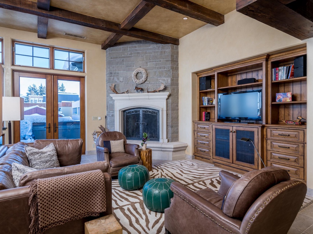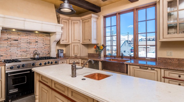 An elegant entryway invites guests into this stunning 2-story condo, providing ample space for boots and bags with its thoughtfully designed built-in cabinetry. The main floor boasts a rich and inviting great room with a gas fireplace and exposed ceiling timbers that create a cozy lodge atmosphere. Warm up and unwind with loved ones on the sophisticated leather furnishings while streaming comedy classics on the large TV. From the living area, French doors reveal a spacious wraparound balcony equipped with a propane grill, offering fantastic views of the bustling downtown street below and the mountains. The adjacent dining area seats 6 around a beautiful wooden table that seamlessly flows into the updated gourmet kitchen with a built-in workspace. Exuding warmth and simplicity with rustic cabinetry and warm copper finishes, the kitchen provides everything necessary for a home-cooked meal, including a high-end Viking gas range that caters to all chefs. Plus, 2 dishwashers, a beverage cooler, and Keurig K-Duo coffee maker add convenience. The laundry room is great for extended stays. Guests can choose from 2 inviting guest bedrooms with private bathrooms on this floor—1 bedroom with a queen bed and the other with 2 twin beds.