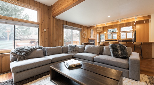 Log-cabin aesthetics merge with mid-century modern architecture inside this welcoming 2-story home. The main level features an open-concept great room with knotty tongue-and-groove walls and large picture windows. In the living area, a charming river-rock fireplace and soft sectional beckon for quiet Winter nights curled up with hot chocolate and blankets relaxing with the group and watching TV. Past the living space is the kitchen, set beneath a vaulted ceiling and equipped with high-end appliances—plus another wood-burning fireplace. Enjoy quick bites at the 4-stool breakfast bar or gather the group for a formal meal at the beautiful wooden table for 12 in the dining nook. Outside, enjoy warmer months with barbecues on the grill and alfresco dining at the 8-seat patio table. Cooler days encourage guests to sink into the hot tub for a starlit soak or slip into the sauna to sweat away worries. Groups or families that need room to spread out will appreciate the den. Mix up drinks at the wet bar before piling around the TV and fireplace, or enjoying an evening spent playing board games—there’s even a desk for guests who need a dedicated workspace. Sleeping accommodations on this level include a sleeper sofa in the den and an adjacent bedroom with a king bed.
