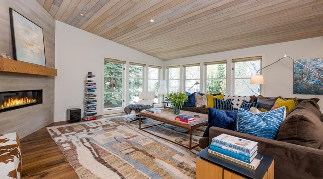 Surrounded by towering aspens and evergreens, this 2-story home’s living spaces feature hardwood floors, a unique wood-paneled ceiling, and generous windows revealing wooded grounds. Put on a favorite playlist and set the mood for fun with the Sonos sound system before retiring to the living space, where a comfy wraparound sofa frames an antique coffee table opposite a TV and modern gas fireplace. Colorful accents, from patterned throw pillows to animal-print ottoman chairs, add a sense of whimsy to the space. Guests can gather for lively meals at the 6-seat custom dining table, with a 3-stool breakfast bar providing extra seating. The gourmet kitchen has everything guests need to prepare meals and snacks, including a Vitamix blender, Nespresso coffee maker, and fondue pot. Head onto the expansive deck to find a private hot tub, gas firepit, relaxing deck furniture, and a natural gas grill for après-ski BBQ, while an additional sitting area in the front of the home showcases clear mountain views. Down the hall, the primary bedroom features a king bed, a gas fireplace, and a luxurious private bathroom with a soaking tub, glass walk in shower, and radiant-heat floors. Adjacent is an office area overlooking the wooded grounds.