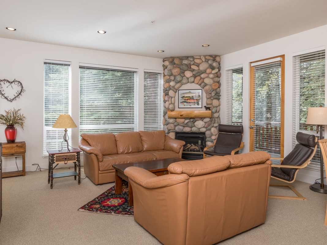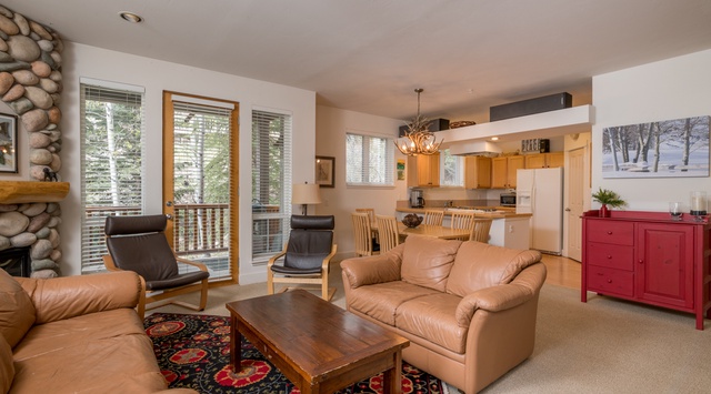 Step inside this single-story condo to discover an open layout featuring natural light and delightful mountain accents, including an antler chandelier and river rock fireplace. The kitchen is fully equipped with everything guests need to make delicious meals. Have friends sit at the 2-seat bar while whipping up waffles, eggs, or smoothies to fuel the day’s fun. For formal meals, there’s a dining table for 6. In the living area, a couch, loveseat, and 2 armchairs provide soft seating for relaxing by the fireplace or screening a movie on the TV and Blu-ray player. During Summer months, spend serene evenings grilling on the deck while enjoying the surrounding natural beauty. When it’s time to turn in for the night, guests can choose between the guest bedroom with 1 king bed, the guest bedroom with 2 twin beds, or the primary bedroom with 1 queen bed and private bathroom. Both the primary bedroom and second guest bedroom have a TV for personal entertainment. A washer and dryer in the hall closet offer convenience for extended stays.
