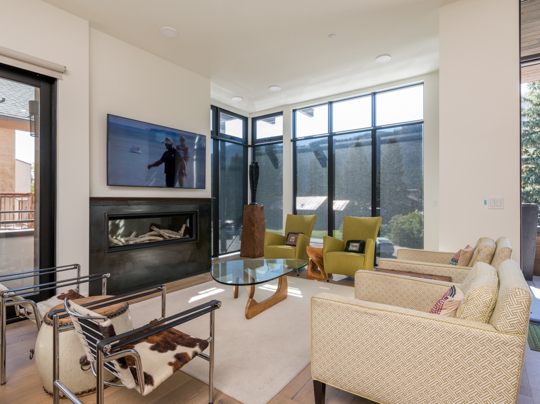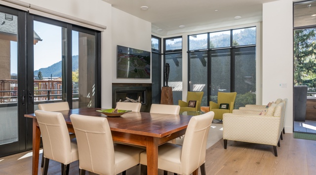 Mountain-chic décor and high-end contemporary finishes define this tranquil, single-story retreat. The condo welcomes guests into a thoughtfully designed open-concept great room featuring walls of glass and picture windows framing views of Bald Mountain. Enjoy a serene evening imbibing in hot toddies or chatting with friends in the living area, where 6 stylish club chairs flank the fireplace and Smart TV to make an intimate gathering space. Steps away, a formal dining table seats up to 6 guests. The gourmet kitchen provides an inspired setting for culinary creation with top-of-the-line appliances and an island that doubles as a 3-seat breakfast bar. Wander out the back door to sip coffee while taking in the view from the spacious deck furnished with 2 chairs and a coffee table. At evening’s end, retire to the luxurious primary bedroom with a king bed, Smart TV, deck access, and a private bathroom with heated floors. Additionally, there are 2 guest bedrooms, with a queen bed in the first and the second boasting a king bed, deck access, and a private bathroom with heated floors. A bonus room with a queen bed offers extra sleeping accommodations. For convenience, there’s a laundry room off the hall.